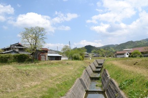 国道沿いには看板も出ていますが、そこからさらに2キロほど歩きます。国道からの道はさらにのどかに。水田や茅葺屋根の農家、そして大きな池があります。この池、人工のものだと思いますが、水面がきれいな青色でした。