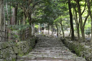 湖東三山ではおなじみの石畳の参道を進みます。青紅葉やまっすぐ伸びた杉の凛とした雰囲気に、ミツマタの花が華やかさを加えてくれています。